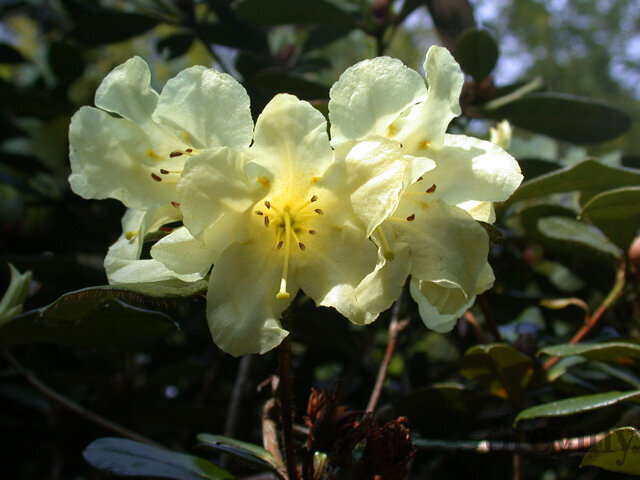 Je to pomerne kompaktný ker s veľkými listami a široko eliptickými. Kvety má veľké, vysoko aromatické, zvoncovitého tvaru. Farba kvetov v mladom veku je bledoružová neskôr obledne. V starom veku sú kvety bielej farby, kresba na nich je stredne výrazná, citrónovo žltá.