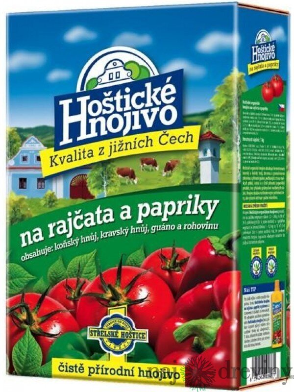 Hoštické hnojivo org. Rajčiny a papr.1kg Hoštické organické hnojivo obsahuje fermentovaný kravský a konský hnoj, drvenú a granulovanú rohovinu a prírodné guáno pochádzajúce z trusu morských vtákov. Jedná sa o čisto prírodný produkt bez prídavkov priemyselne vyrábaných zložiek. Hnojivo dodáva rastlinám nielen potrebné živiny, ale aj výrazne aktivizuje pôdnu mikroflóru.