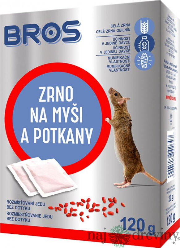 Používajte biocídy bezpečne. Pred použitím si vždy prečítajte etiketu a informáciu o výrobku. Zrno Bros je nástraha na báze starostlivo vybraných chutných obilných zŕn. Pre hlodavce, ktoré majú radi obilie je veľmi dobre stráviteľná. Obsahuje látku, ktorá bráni náhodnej konzumácii ľuďmi a domácimi zvieratami. Dávkovanie: myš - 60 g na každých 5-10 m, potkan - 100 g na každých 5 - 10 m. Umiestnite do nástrahových staníc, ktoré sú zabezpečené proti náhodnému otvoreniu a na miestach, kde sa vyskytujú hlodavce. Druhy nebezpečnosti : H373 Môže spôsobiť poškodenie orgánov (krv) pri dlhšej alebo opakovanej expozícii.