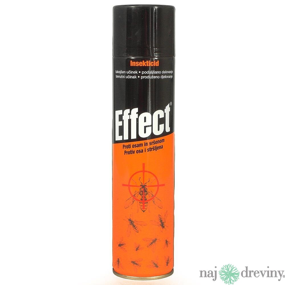 Effect aerosol proti osám a sršňom je kontaktný insekticíd s okamžitým a predĺženým účinkom, určený k hubeniu ôs a sršňov. Zvláštne zloženie dvoch aktívnych látok umožňuje predĺžený účinok. Tým ochráni váš obytný aj iný priestor ešte dlho bez obtiažneho hmyzu (ôs, sršňov,...). Prednosti: Vzhľadom k tomu, že aerosol nesie aktívnu látku až do vzdialenosti 4-6 m, je možné hniezdo postriekať z väščej vzdialenosti. Insekticíd je vo forme rozprašovača. Okamžité pôsobenie. Predĺžené pôsobenie. Obsahuje odpudzovač, zamedzujúcí návrat hmyzu na ošetrený povrch. Prostriedok obsahuje tiež prísadu arómy - osviežujúcu vzduch.
