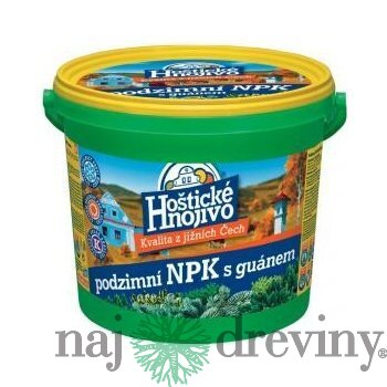 Jesenné hoštické organické hnojivo NPK s guánom Rozsah a spôsob použitia: Jesenné hoštické hnojivo NPK je čisto prírodné organické hnojivo bez prídavku priemyslovo vyrobených zložiek. Vďaka zvýšenému obsahu draslíku má komplexné využitie v záhrade k príprave rastlín na zimné obdobie a taktiež k prirodzenej ochrane rastlín proti vy mŕzaniu. Hnojivo obsahuje guáno (mineralizovaný trus morských vtákov) a je vhodné pre všetky druhy ihličnanov (tují, cypriškov, borovíc, smrekov a mnoho ďalších), ale taktiež pre všetky druhy listnatých, okrasných i ovocných stromov a kríkov. Tiež je veľmi vhodné k základnému vyhnojeniu pôdy, buď na jeseň alebo pri jarnej príprave pôdy. Hnojivo sa aplikuje na povrch zeminy rozhodením a potom sa mierne zapraví do pôdy (ručným rytím, zahrabaním a pod.) a dostatočne zavlaží. V prípade nespotrebovania na jeseň sa môže hnojivo použiť univerzálne aj v jarných mesiacoch a taktiež v priebehu vegetácie.