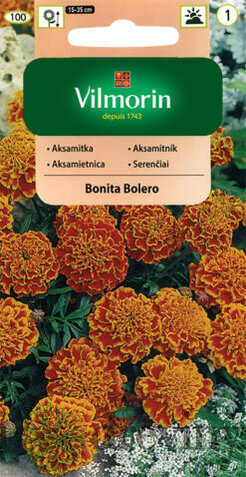 Latinský názov: Tagetes patula fl.pl. Odroda: Bonita Bolero Zakrývaný výsev: IV Výsev do pôdy: V Kvitnutie: VI-X Sadenie: V URČENIE: Rastlina sa jednoducho pestuje, nenáročná. Pokyn: Na záhony, lemovanie, stojany na kvety, balkónové črepníky. Stanovište: Slnečné alebo polotienisté, rastie dobre na každej pôde. Popis: Jednoročná, Do záhonov, Balkónová
