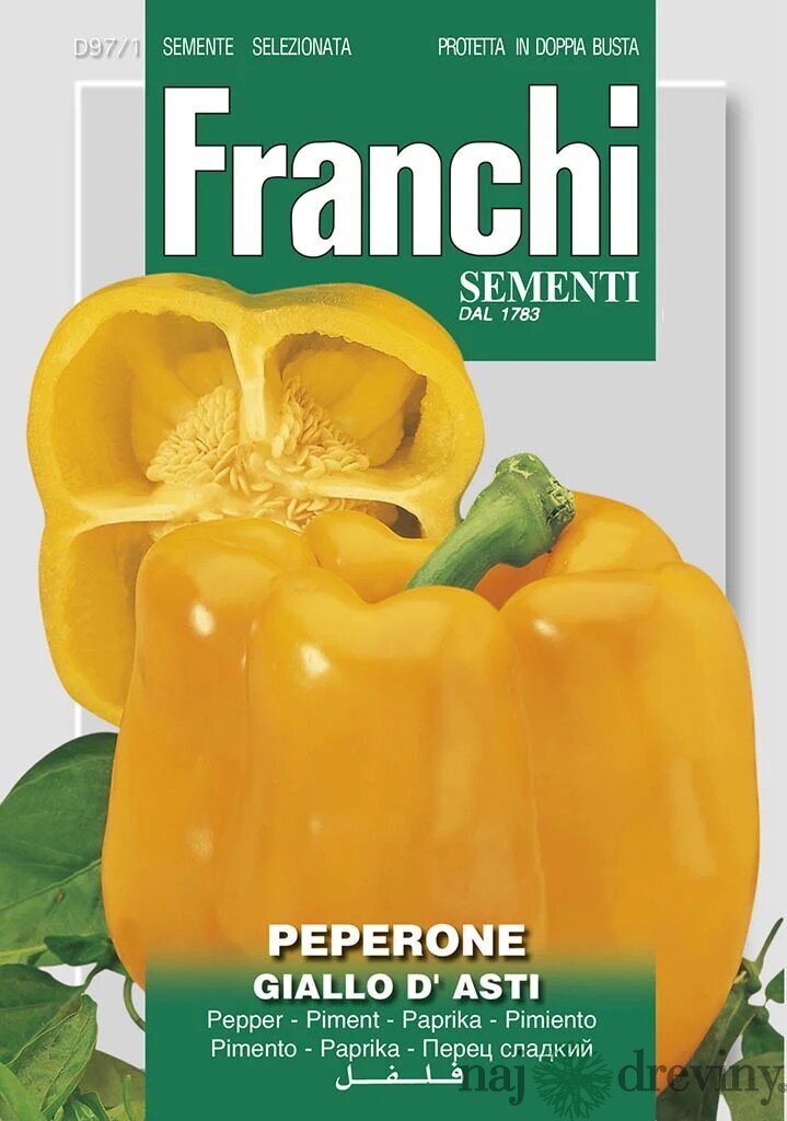 Paprika – GIALLO D’ASTI – semená, 2 gramy Stredne skorá odroda. Rastlina je energická, dobre rozvetvená a s dobrým výnosom. Plody sú veľké, 3-4 laločné papriky, kvadratické, sladké a mäsité. Hrubostenné. Sú výborné pre priamy konzum, kuchynskú úpravu i konzerváciu. Stredne skorá, sladká odroda. Jedná sa o klasickú štvorcovú žltú papriku z Piemonte v severnom Taliansku. Produkuje 4 laločnaté hranaté papriky, ktoré sú sladké a mäsité. Je považovaná za jednu z najlepších talianskych paprík. Je to energická rastlina s dobrou produkciou. Výsev: II – V Zber: VII – X Gramáž: 2 gr.