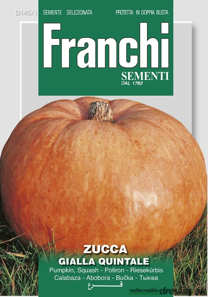 Tekvica – QUINTALE SEME GIALLO – semená 4gr. Stredne neskorá odroda. Bujne rastúca rastlina s vynikajúcou produkciou veľkých plodov. Plody sú hladké a oranžovej farby. Dužina je mäsitá, žltá a mierne sladká. Výsev: III – VI Zber: VIII – XI Gramáž: 4g