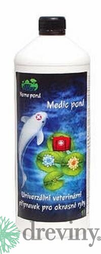 MEDIC POND je kombináciou troch širokospektrálne pôsobiacich látok, účinkuje antiparaziticky, antibakterálne a antimykoticky. Prípravok pôsobí proti baktériám spôsobujúcích napríklad infekčnú vodnateľnosť či rozklad plutiev, parazitom (Ichtyophtyrius, Ichtyobodo, Piscinoodinium, Chilodonella, Gyrodactylus i.) a plesniam (povrchové zaplesnenia rýb i.). Prípravok sa tiež používa ako prevencia proti zavlečeniu choroby pri kúpe nových rýb. Použitie: Použitie pri výskyte parazitických, bakteriálnych a mykotických ochorení jazierkových rýb: Liečebná kúra by mala trvať minimálne 9 dní v troch krokoch. - Prvý deň začnite kúru dávkou 50 ml na 1 m